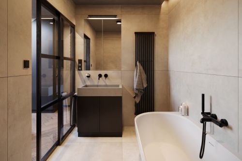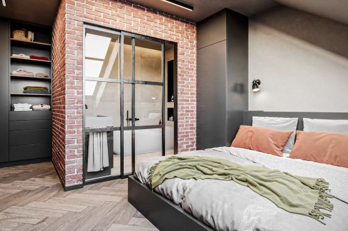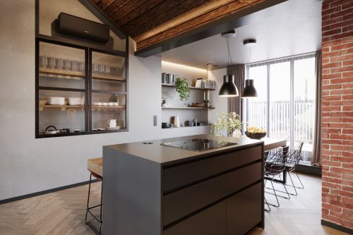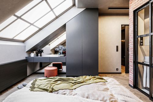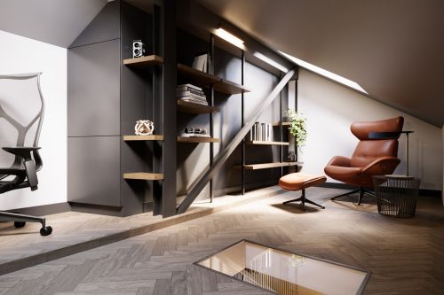 Industriální byt vznikl z developerského projektu 3 bytů v podkroví v Praze na Andělu. Každý byt je laděn do jiného tématu. Tento je industriální. Byty mají samy o sobě krásnou dispozici s vysokými stropy do podkroví. V podkroví se nachází malá galerie s pracovnou. Industriální styl se ke struktuře bytu vysloveně nabízel a zcela přirozeně si ho podmanil.