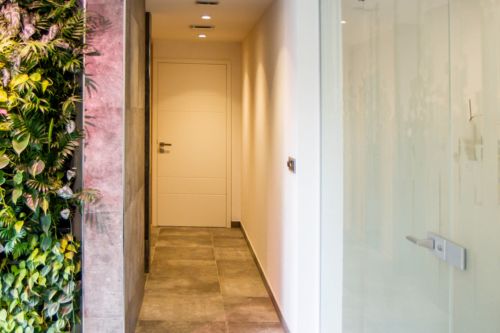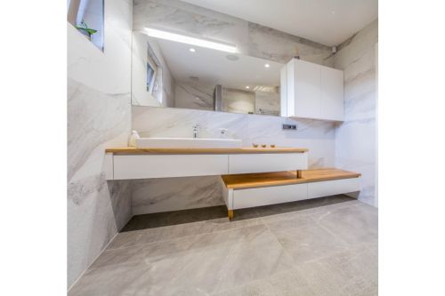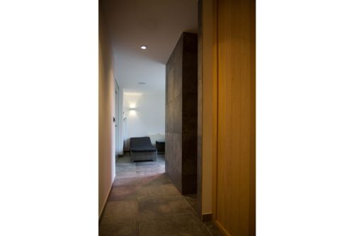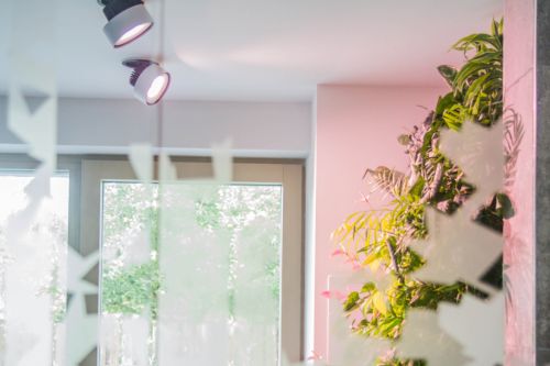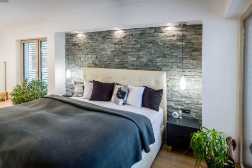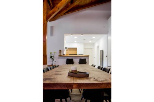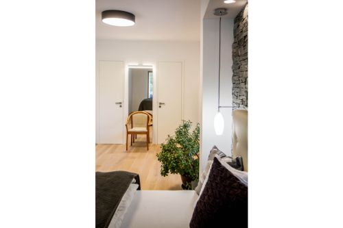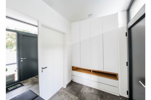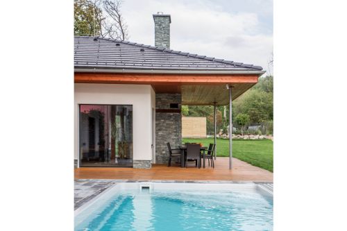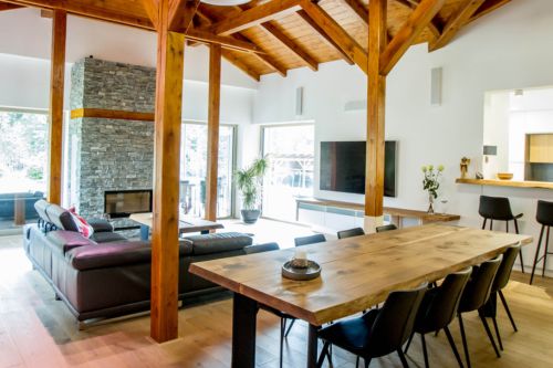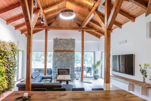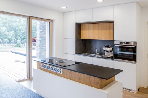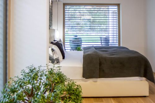 Interiér pasivního dvougeneračního domu byl od počátku pojat velkoryse s odkazem na téma přírody. Samotná stavba se pyšní obrovskými dřevěnými krovy a přírodním kamenným obkladem. Nábytek je kombinacemi bílé, dubové a antracitové barvy. Téma stromu/přírody se opakuje v několika detailech. Příkladem jsou: grafický potisk skleněné stěny, který znázorňuje mihotání listů stromů, jídelní stůl, který  je tvořen rustikální dřevěnou deskou, vegetační stěny, použití cortenu na krbu, který evokuje barvu podzimního listí a další.