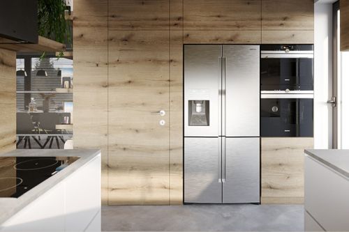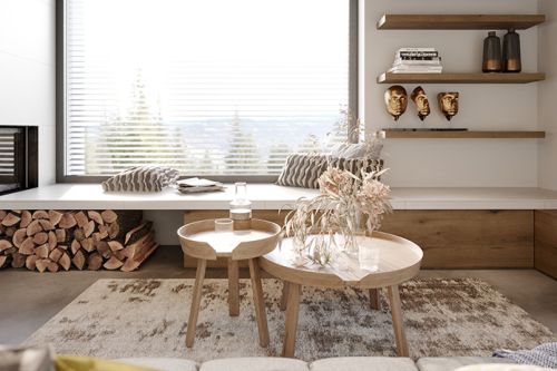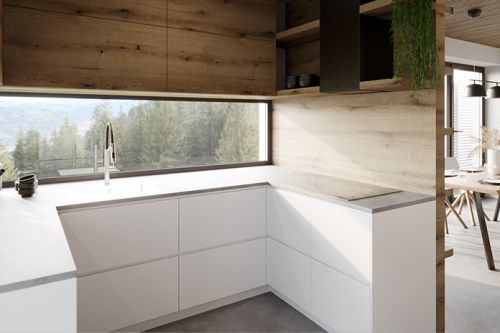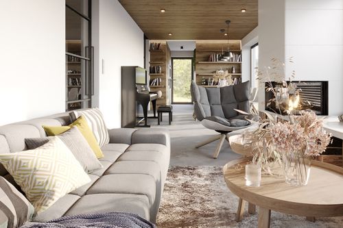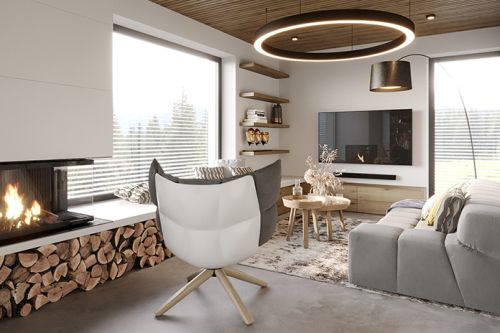 Zásadním prvkem interiéru je dřevěný podhled z desek s rýhováním. Naopak podlahová krytina je navrhnuta v nadčasovém dekoru imitace betonu. Díky jednoduchému dekoru podlahy jsme si mohli dovolit použít nábytek s dřevěnými prvky.