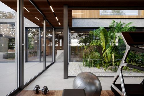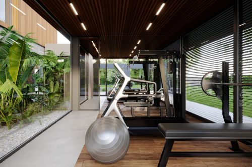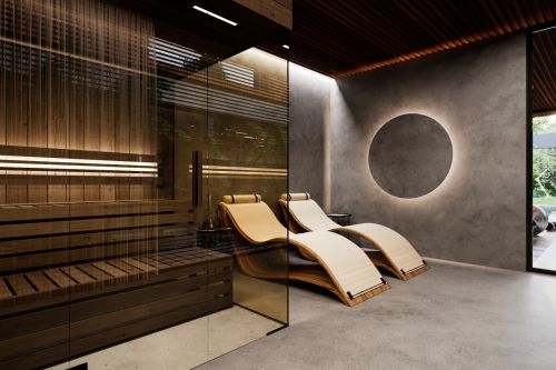 Ve moderní luxusní vile jsme navrhovali kromě klasických obytných místností také saunu a fitness.