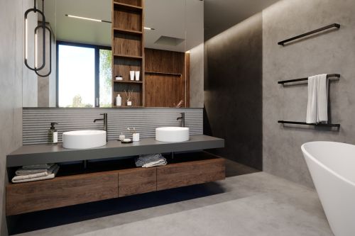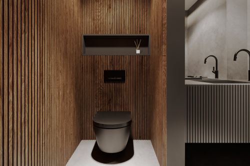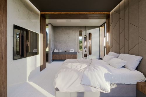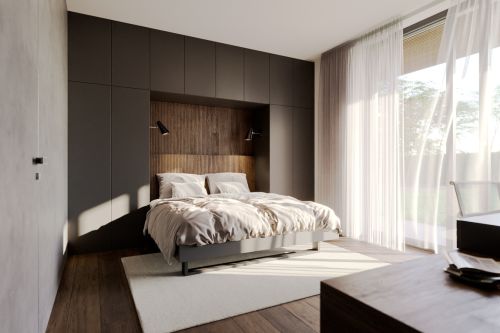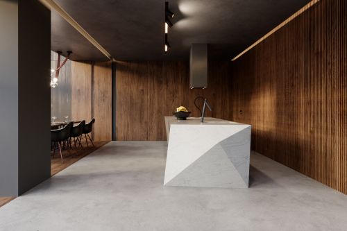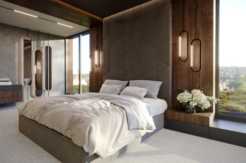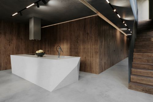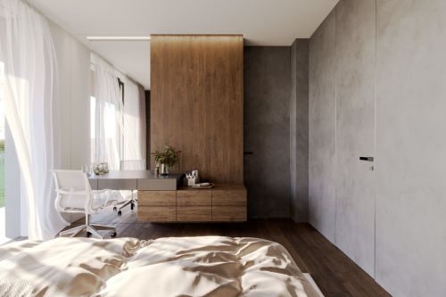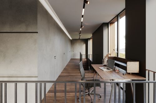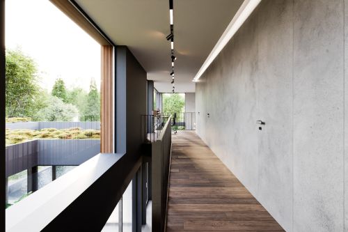 Interiér vily vznikal společně s návrhem celého domu. Klienti měli jasnou představu o tom, jak by měl být interiér laděný. Přáli si tmavší materiály, spolu s tmavším hladkým dřevem, stěrkovu a dřevěnou  podlahou. Stěny neměly být bílé. Každá stěny domu je obložena, zakryta nábytkem nebo opatřeba stěrkou.
