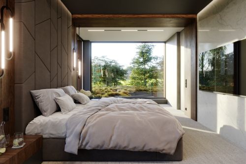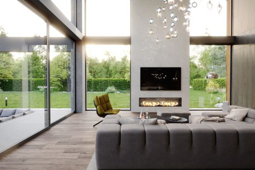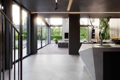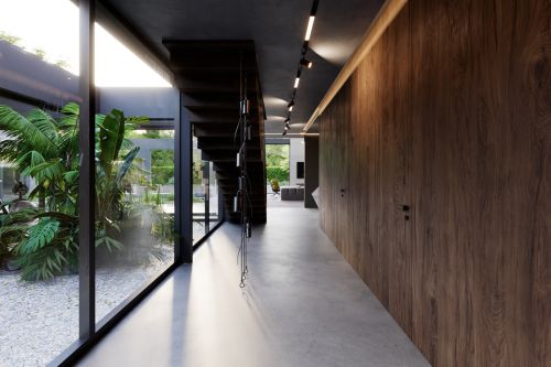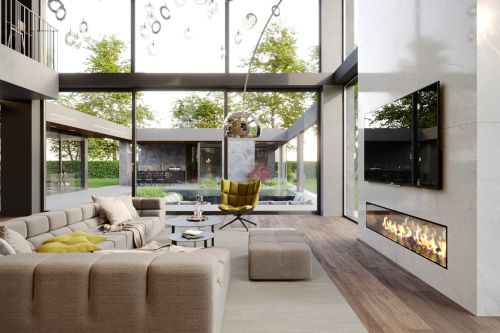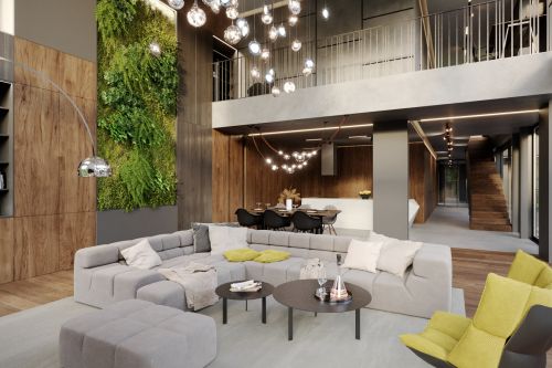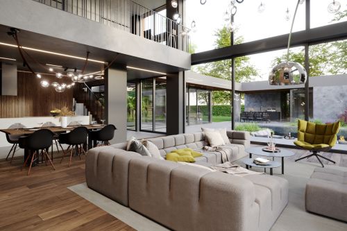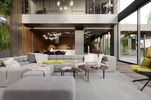 Dominantou interiéru je obývací pokoj s výškou 7 metrů. Uprostřed dispozice domu se nachází zelené  atrium.