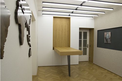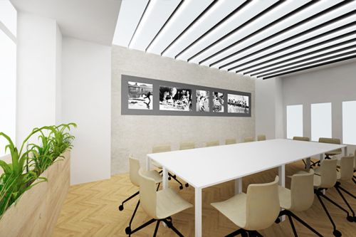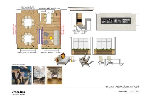 Interiér zasedacích místností je pojat netradičním způsobem. Splnění akustických parametrů je zde již samozřejmostí a novou přidanou hodnotou se stává atmosféra obou místností. Z předložených variant si klient vybral téma blízké přírodě, které se pak odrazilo na přírodních materiálech, množství květin a zemitých tónech nábytku.