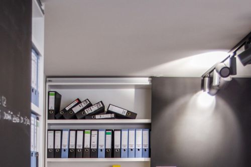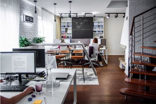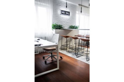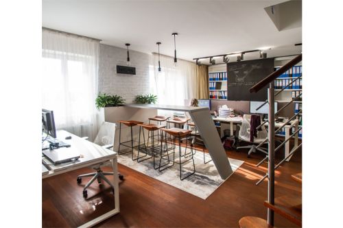 Kancelář v industriálním stylu byla rozvržena tak, aby obsáhla co největší počet pracovních míst a zároveň, aby se zde nacházel dostatečný úložný prostor, který společnost zabývající se účetnictvím vyžaduje. Dominantou prostoru je barový pult se skosenou podnoží, s koženými barovými židličkami s kovovou antracitovou podnoží. Typový kancelářský nábytek jako jsou kancelářské židle a stoly byly vybrány z portfolia společnosti Cre8. Záměrně jsme vybrali židle Sayl společnosti Herman Miller, které jsou velice subtilní a jejich design nenaruší malý prostor kanceláře.