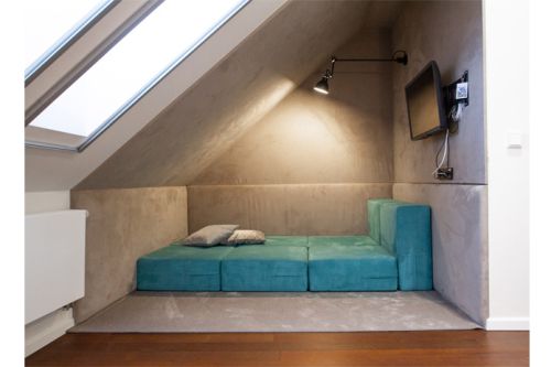 Konferenční místnost pro 6 lidí je tvořena stolem se šikmou podnoží, vestavěným květináčem v nábytku a bílými kovovými židlemi. V rohu místnosti se nachází celopolstrovaný relaxační koutek s televizí.