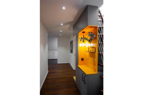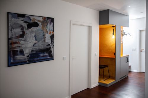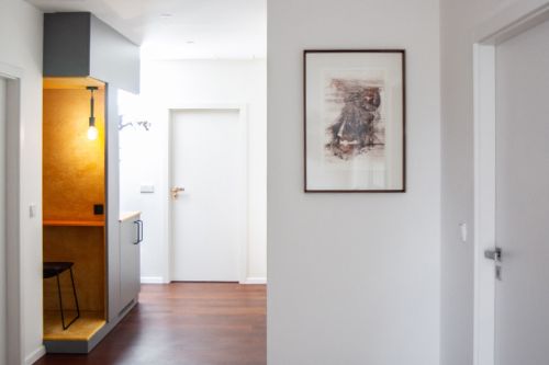 Vstupní prostor je kromě úložných prostor obohacen o zajímavou formu háčků, které jsou umístěny na roxorové tyči. Ihned po otevření dveří zahlídnete logo společnosti na textilem obložené zdi.