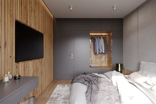 Základ bytu je tvořen dřevěnou, mírně bělenou podlahou a bílými dveřmi. Vzhledem k velkému prosklení bytu jsme si mohli dovolit antracitovou, výraznou barvu kuchyňské linky, nad kterou jsme spustili laťový podhled. Jídelní stůl je důmyslně přistaven ke stavebné šachtě a pomocí pevného skla vytváří zajímavý prvek interiéru. Důležitou součástí návrhu jsou i záclony se závěsem, který má hrubou texturu.