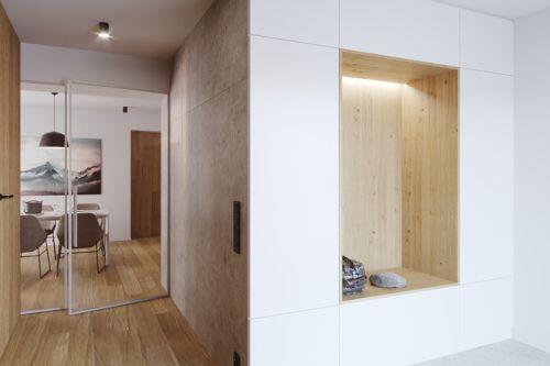 Interiér je s exteriérem vizuálně svázán použitím kamenného obkladu v obývacím pokoji. Dále je celý návrh interiéru propojen pomocí obkladu v imitaci betonu a obkladu dřevěných latěk, které se nachází na stěně v předsíni a přes jídelnu vedou až do ložnice rodičů.