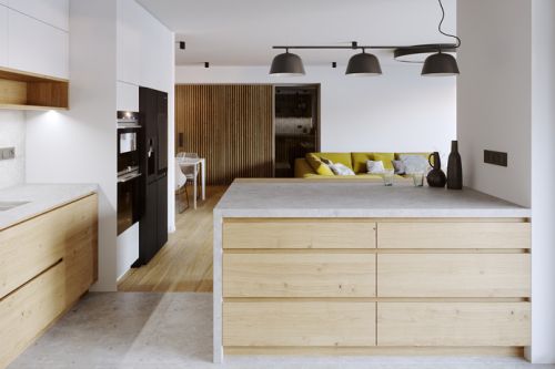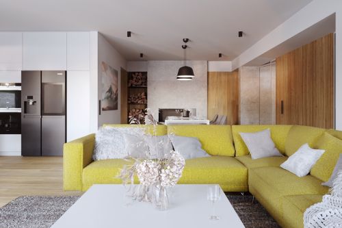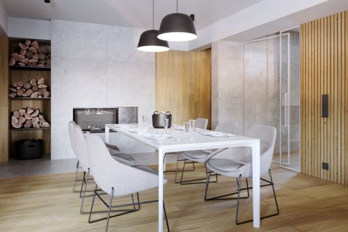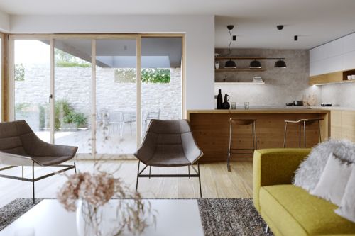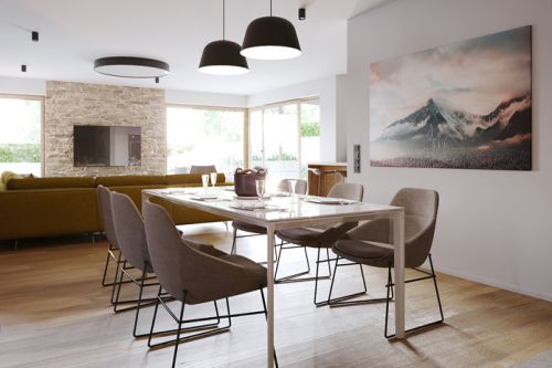 Ústředním bodem domu je obývací pokoj spojený s jídelnou a kuchyňským koutem. Jídelně dominuje velký bílý moderní stůl s pohodlnými čalouněnými židlemi a krb opatřený  stěrkou. V obývací části je jasně žlutá rohová pohovka s nastavitelnými opěrkami hlavy, která barevně oživuje interiér. Televizní stěna je obložena stejným kamenným obkladem, který se vyskytuje v exteriéru. Kuchyňský kout je materiálově tvořen svěží kombinací betonu, dřeva a bílé barvy. Kuchyňský ostrůvek tvoří dělící linii mezi kuchyní a obývacím pokojem, kde slouží jako barový pult doplněný moderními barovými židličkami v hnědé kůži.