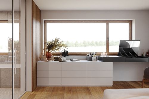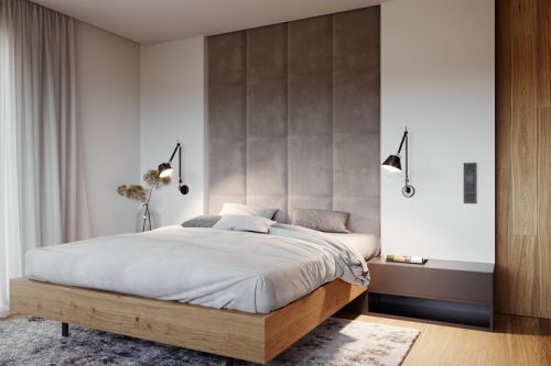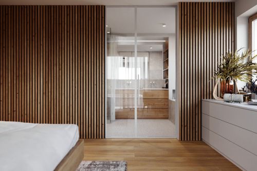 Vstup do manželské ložnice je z obývacího pokoje přes předsíňku, zde se nachází dveře do šatny i ložnice. Manželská postel je zapuštěná do polstrované niky, která je osvětlena led pásky. Pod oknem naproti postele se nachází na míru navržená komoda s kosmetickým stolem. Ten má zrcadlo schované v desce stolu a vyklápí se nahoru. Prosklené dveře ve stěně s laťkovým obkladem vedou do koupelny rodičů, která je tvořena stejnou materiálovou paletkou, jako kuchyně. Zajímavým momentem koupelny jsou umyvadla zasunutá v nice, která je shora nasvětlená a na straně tvoří prostor na dřevěné poličky.