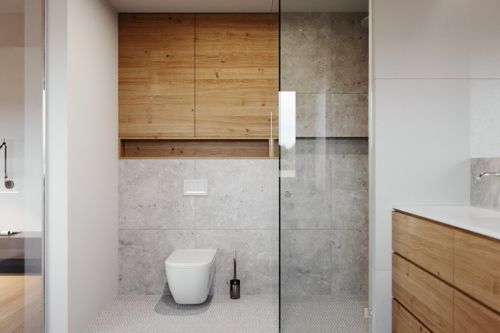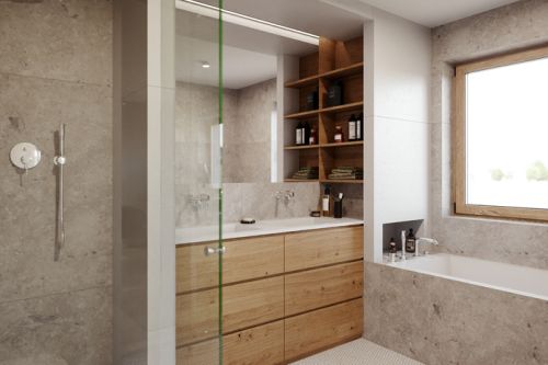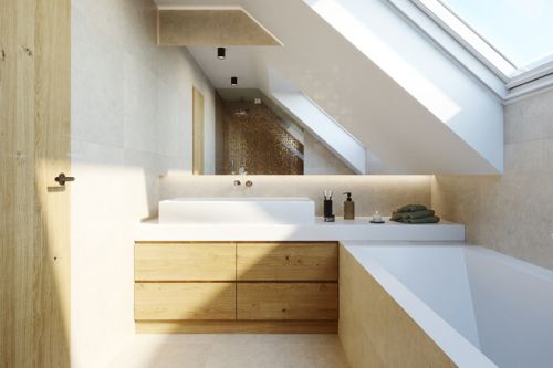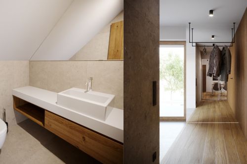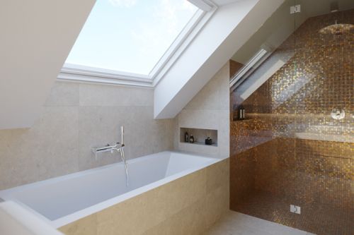 Koupelna dětí v patře a záchod umístěný přes chodbu, jsou laděny do béžových odstínů. Dominujícím prvkem je vana, která se nachází pod nově navrženým střešním oknem. Prostorný sprchový kout je opticky vsazený do boxu ze zlaté mozaiky.