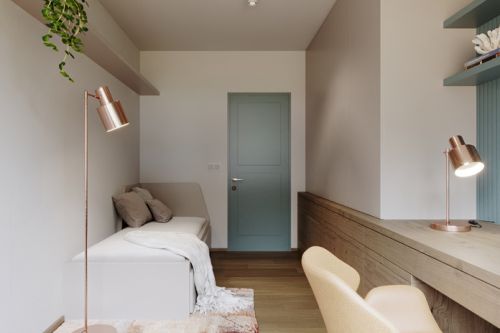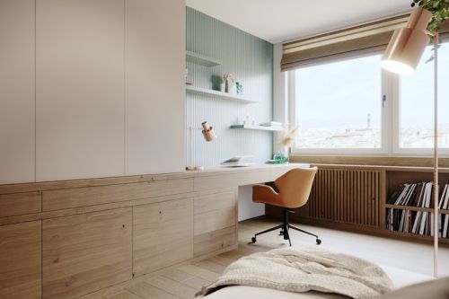 Výrazné barevné schéma petrolejové zelené barvy, tmavého dřeva a světle šedé, s doplněním světle hnědé kůže, je použité v celém interiéru. Hlavním cíli návrhu bylo vytvoření velkého množství úložného prostoru, převážně na knihy, zakrytí topení a vytvoření galerie pro oblíbené obrazy majitelky.