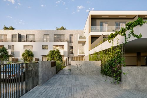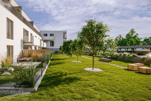 Tvar a umístění domu reaguje na okolní zástavbu a orientaci ke světovým stranám. Dům se obrací směrem do zelených ploch předzahrádek a společné zahrady a je odcloněn od přilehlé komunikace zastřešenými parkovacími stáními, které jsou kryté zelení, jak na střechách, tak na svislých konstrukcích.