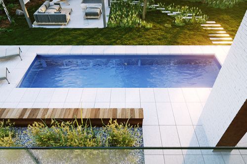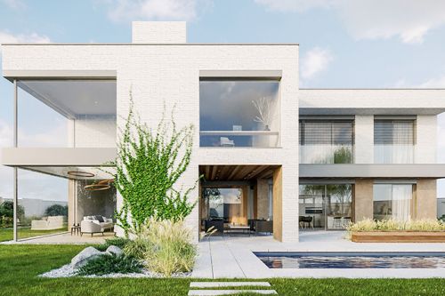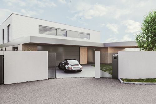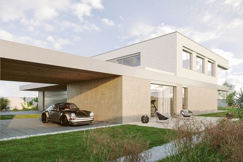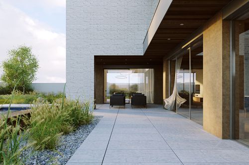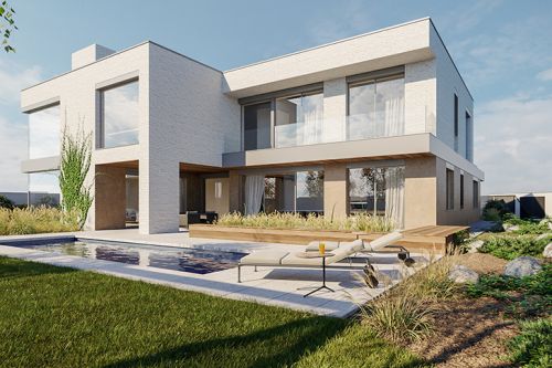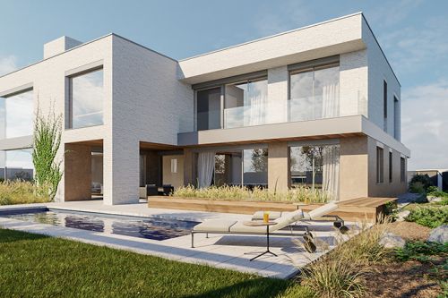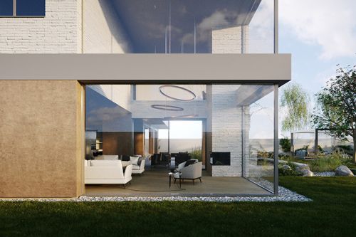 Hlavními prostory domu jsou velká kuchyně s jídelnou, která je oddělená od obývacího prostoru s krbem. Obývací pokoj je otevřen do patra a prosklen rohovým zasklením v obou podlažích. Hlavní obytné plochy jsou obráceny do prostorné terasy v přízemí a v horním patře na balkón. Vstup do domu je lemován horizontálním zastřešením které navazuje na jednopodlažní část objektu.