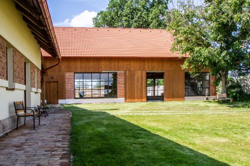 Na stodolu navazují zrekonstruované bývalé chlévy, které jsou nově využité kuchyněmi pro kurzy vaření.