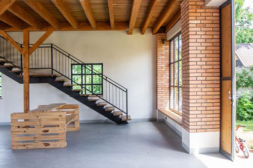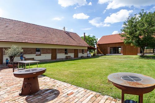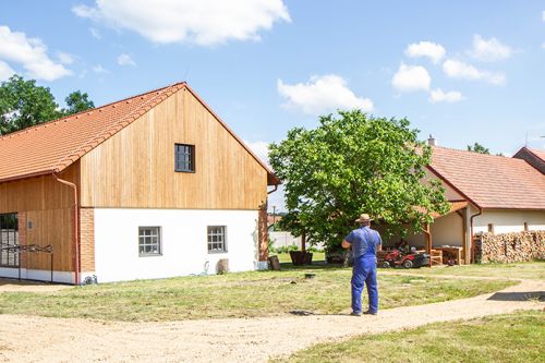 Protože původní stodola vlastně funkčně vyhovovala klientovým potřebám, nebylo potřeba se příliš odchýlit od původního vzhledu. Nosný systém stodoly jsme principielně ponechali, jen přizpůsobili možnostem současného stavitelství. Nebáli jsme se použít betonové a ocelové konstrukce a vytvořit moderní stodolu. Dalším cílem bylo stodolu prosvětlit velkými okny tak, abychom do stavby dostali dostatečné množství světla a přitom zachovali genius loci. Okna jsou tvořena ocelovými rámy a jednoduchou skleněnou výplní. Okna jsou na nízkých parapetech, které je možné využít i jako lavice.