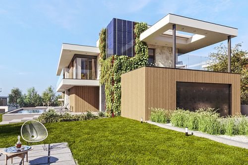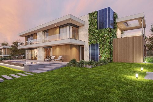 Domy jsou navržené s ohledem na současné klimatické poměry a moderní technologii směřující k nízké spotřebě energie. Základní obdélná hmota domů je horizontálně členěna kšilty, které mají funkci stínění a venkovního ochozu. Ochoz propojuje jednotlivé místnosti ve druhém patře. Jednoduchý tvar domu je přerušen vyšším krčkem, který navazuje na střešní terasu. Fasády objektů jsou artikulovány velkoformátovými okenními výplněmi navrženými přesně na míru interiérového rozvržení a plnými profily, které jsou z vnější strany opatřeny odolnou betonovou stěrkou.