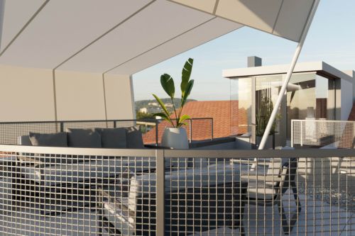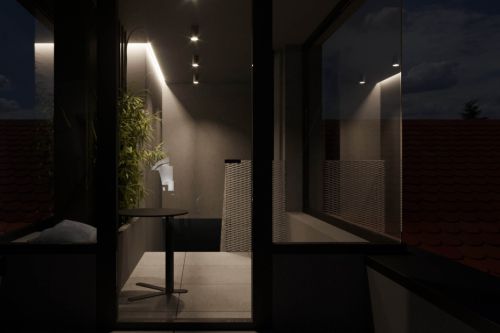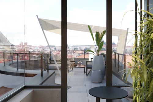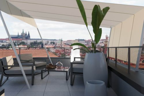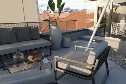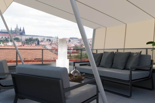 Zadáním návrhu bylo zrekonstruovat prostor střešní terasy tak, aby opět získal funkci relaxační a aby zde vznikl pohodlný přístup z podkrovního bytu přímo ven. Využili jsme stávajícího stavu, který jsme zbytečně nerozšiřovali. Vytvořili jsme nové schodiště v místě domovního světlíku, stávající stříšku jsme využili k uzavření komunikace a venkovní prostor jsme opatřili odjímatelnou pergolou, která umožní pobyt na střeše i za horkých letních dnů. Veškeré povrchy a použité materiály jsou moderní, ale propustné a subtilní, tak aby střešní krajina nebyla porušena.